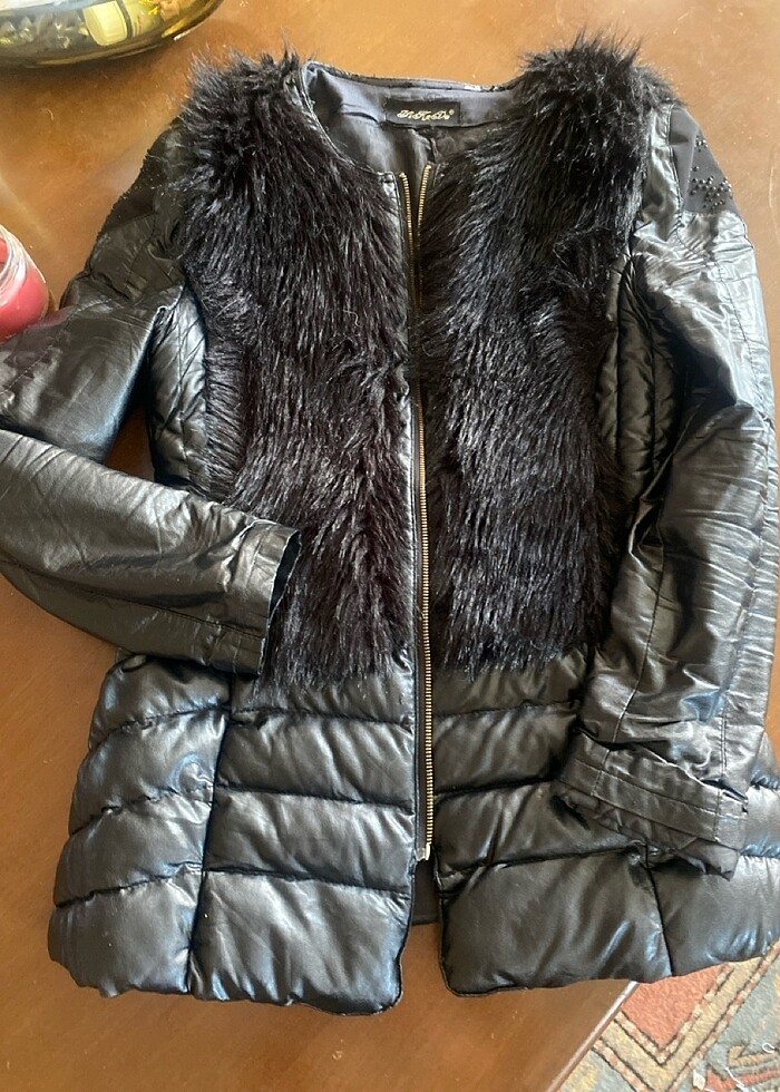Peluş yaka ve göğüsü fermuarlı cepli omuzlarında küçük parlak
