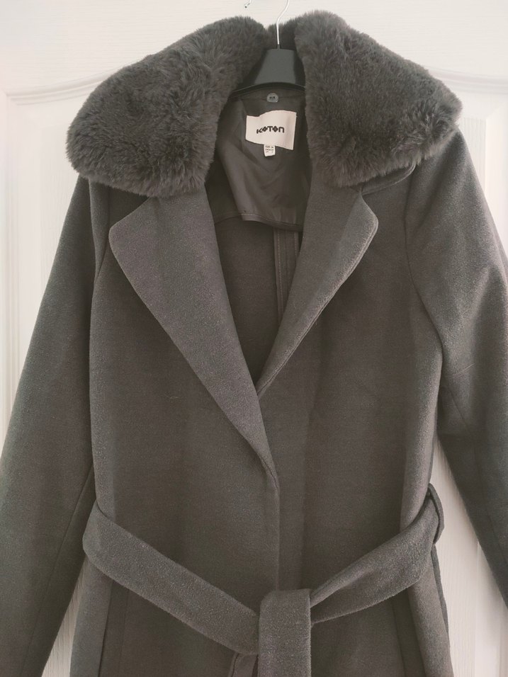 Peluş yakalı ve kemerli gri kaban, kalın ve sıcak kumaştan yapılmıştır. Soğuk havalar için uygundur.