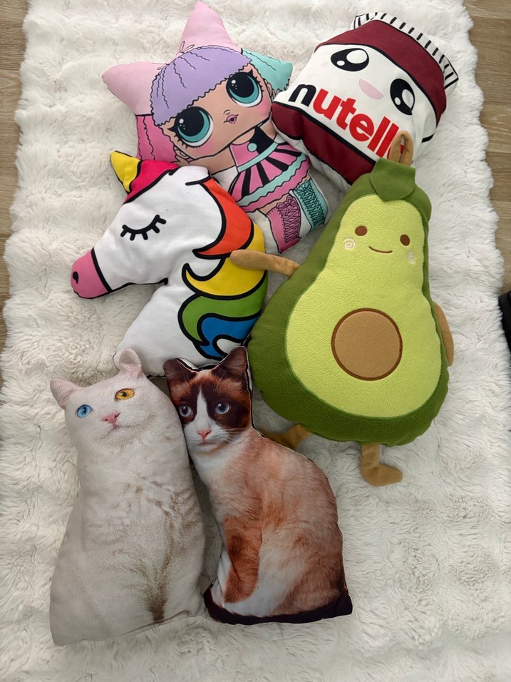 Unicorn, avokado, Nutella kavanozu, çizgi karakter bebek ve iki kedi figürlü renkli peluş oyuncak seti. Yumuşak ve sarılmalık.
