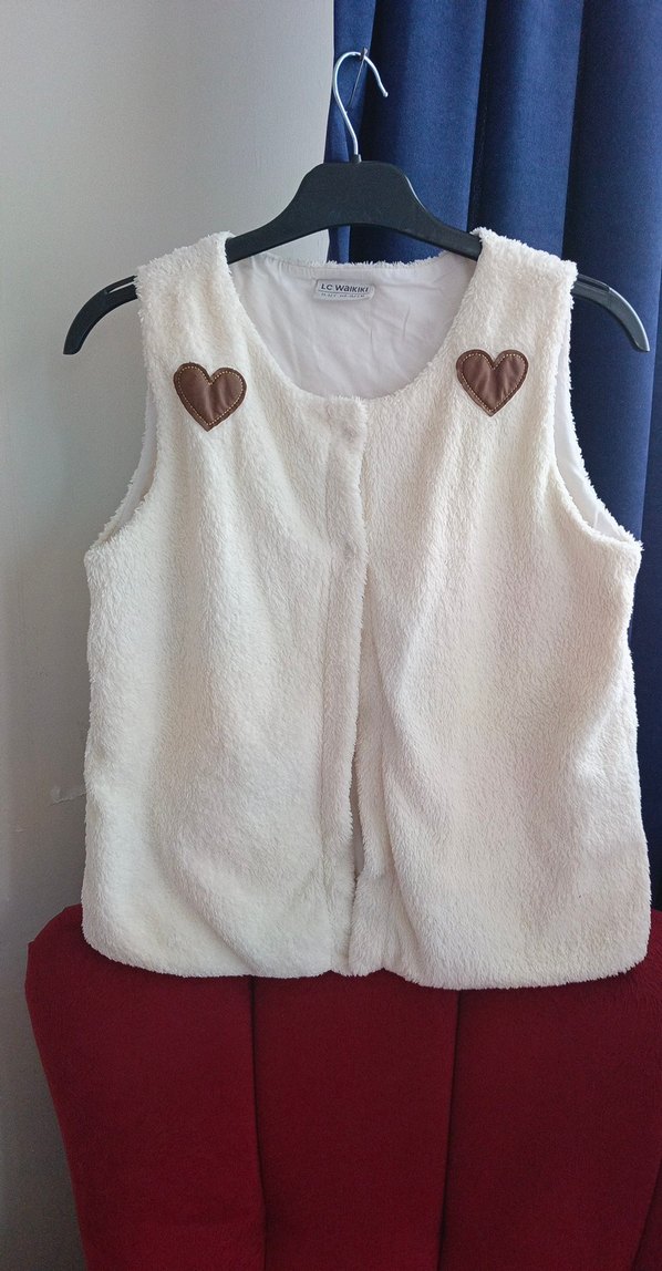 Düğmeli, yuvarlak yakalı, yumuşak ve sıcak kumaştan yapılmış, kalp desenli iki patch ile süslenmiş, salaş kesim beyaz yelek. İçi pamuklu kumaş, tertemiz.