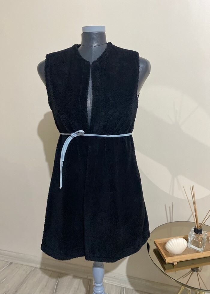 Peluş yelek uzunluğu 85cm dir kemerle çok şık duruyor