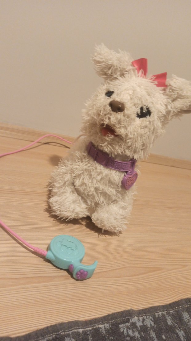 Yumuşak ve kabarık beyaz peluş oyuncak köpek, pastel pembe fiyonk ve tasma ile. pillidir ve tasmaya basinca havlayarak yurume ozelligi vardir.Fur real markadir.2.500 tlye alinmistir.