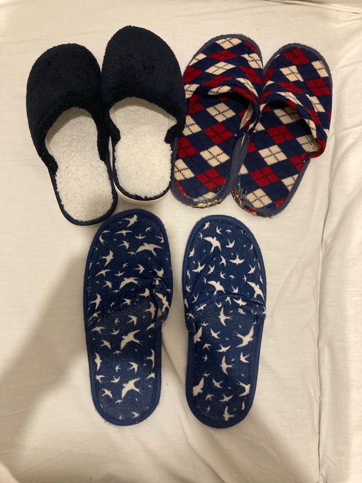 Yumuşak ve sıcak kumaştan yapılmış koyu mavi kadın ev terlikleri, düz tabanlı ve ayarlanabilir Velcro kapamalı. Günlük kullanım için rahat. Hepsinin fiyati dır kondisyon ları resimlerde mevcut inceliyip aliniz