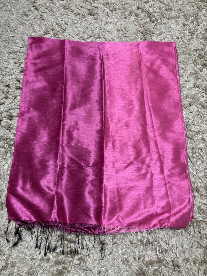 Parlak pembe renkte, ipek dokulu kadın şalı. Çift taraflı Fuşya ve şeker pembesi. Tek bir yerinde ufak hata var resimde ekli ama hiç kullanılmadı tafta ipektir çok ince ya da çok kalın değil tok durur marka temsili