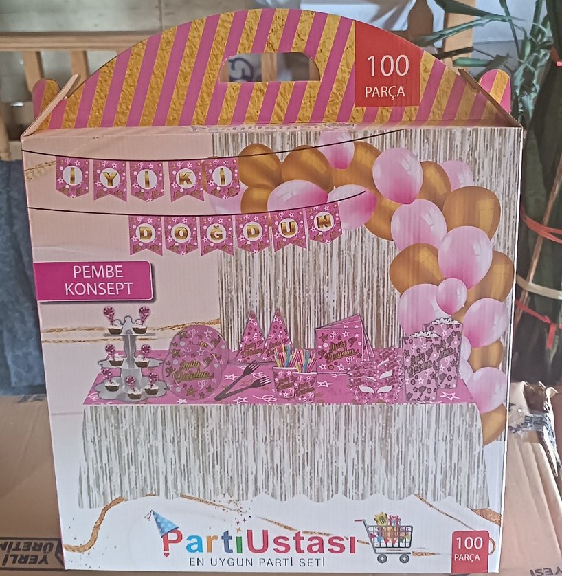 Pembe pastel renkli 100 parça parti seti, doğum günü yazılı süslemeler, balonlar ve masa gereçleri içerir. Kutulu ve kullanıma hazırdır.