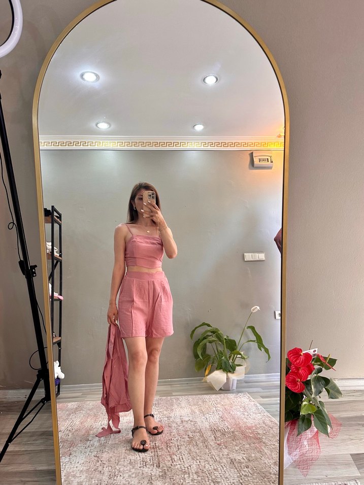 Pembe mini askılı ve straplez yakalı, bol kesimdir. Keten kumaştan üretilmiş olup gündelik kullanıma uygun, minimal ve normcore tarzda şık bir görünüme sahiptir.