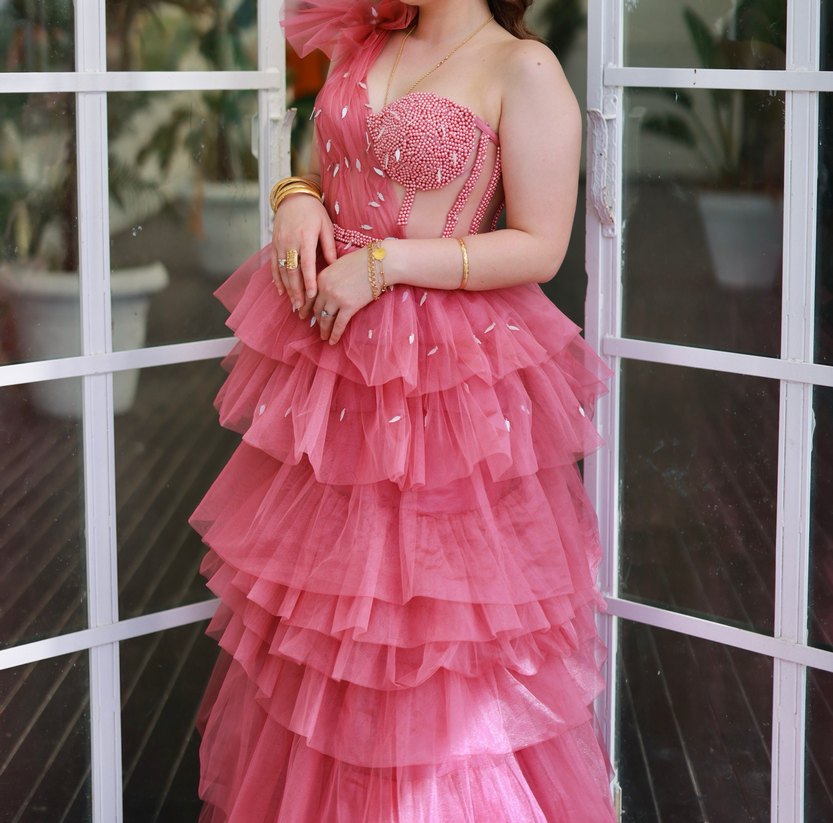 Pembe straplez abiye elbise, işlemeli detaylar ve fırfırlı tül ile süslenmiş, şık ve gösterişli bir tasarıma sahip. Özel dikim elbise marka temsilidir 36-38 uyumlu