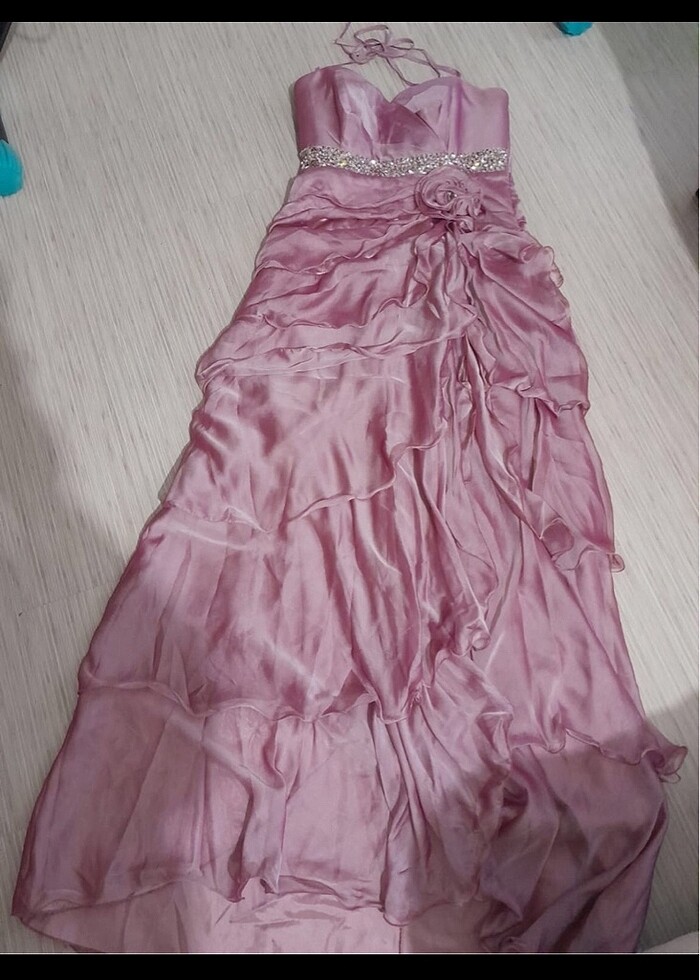 İçi astarlı kat kat parlak tül kumaşlı gül kurusu renkli şık temiz abiye Sadece 1 gün mezuniyette giyildi Pul ve taş işlemeli