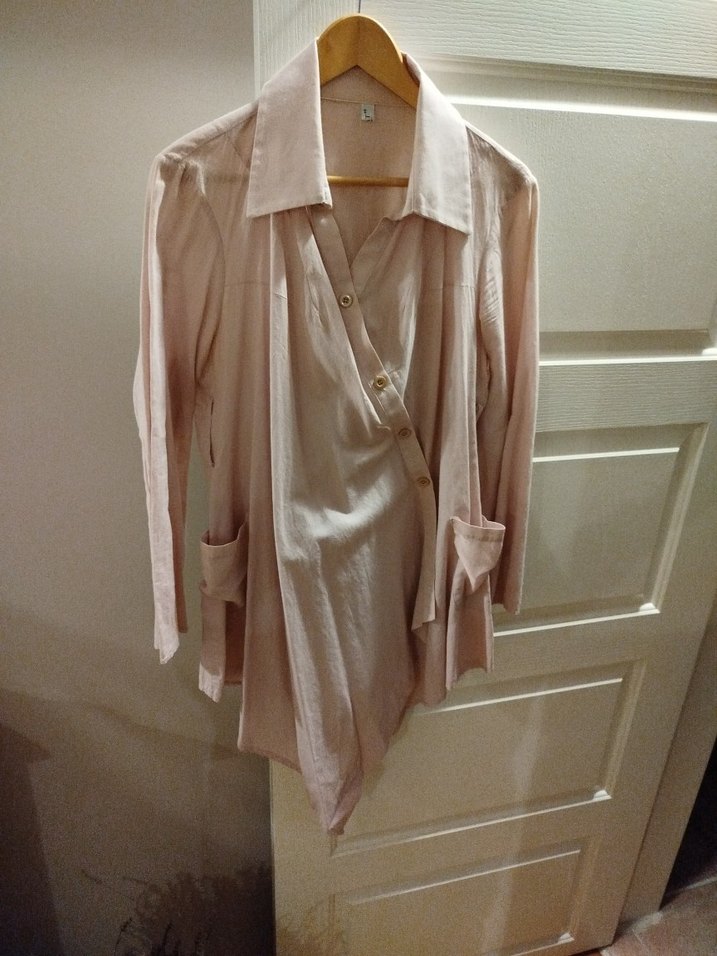 Pembe (açık lila)keten kumaştan, uzun kollu, dökümlü ve bol kesim kadın gömleği. Notched lapel yakalı, rahat ve trend görünümlü.