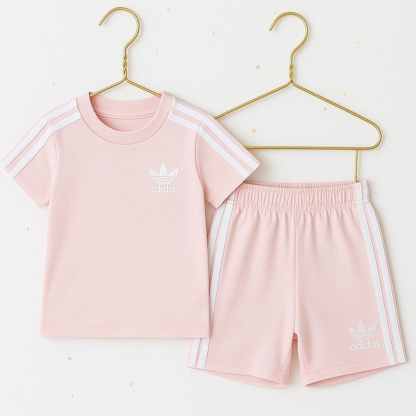 Pastel pembe renkte, kısa kollu tişört ve şorttan oluşan Adidas bebek kız takımı, baskılı logo ve çizgilerle zahmetsiz şıklık sunar. 4/12 yaş aralığında farklı renkleri mevcuttur