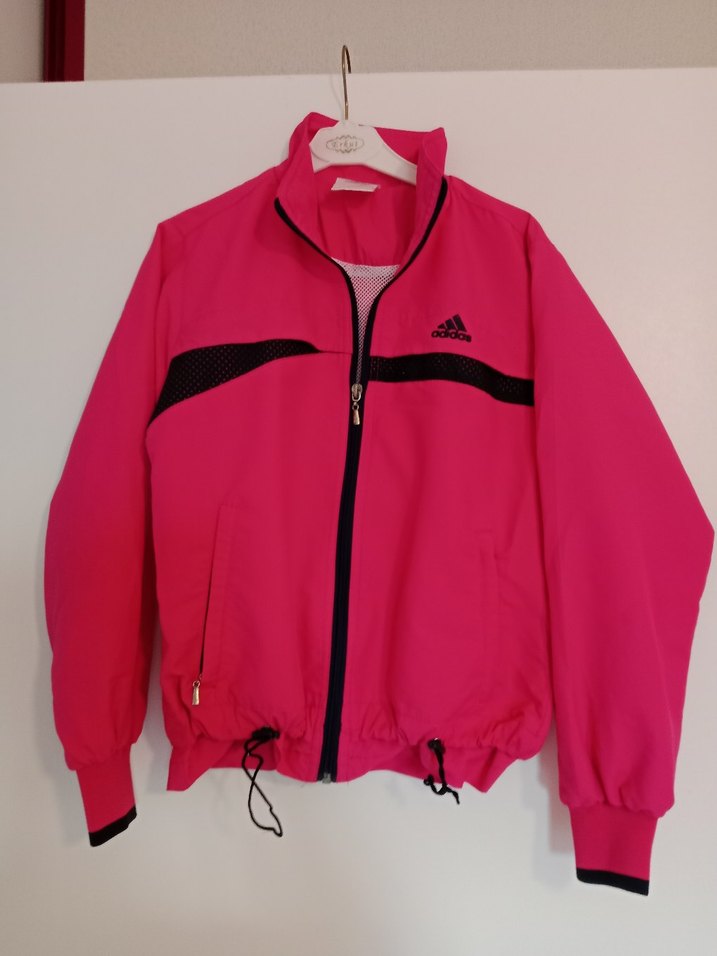 Yumuşak ve sıcak kumaştan, bol kesim, koyu pembe Adidas ceket. Yüksek yakalı ve uzun kollu, fermuarlı ön ve siyah detaylar içerir. Spor sokak stili için uygundur.