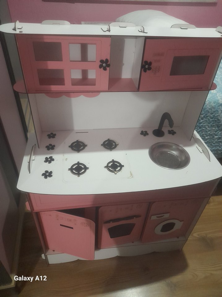 Açılır kapaklı, ocaklı ve musluklu pembe ahşap çocuk oyun mutfak seti.