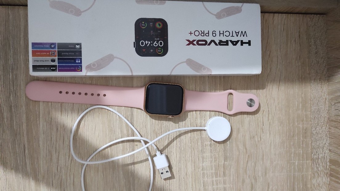 Pembe renkte, dijital ekranlı ve USB bağlantılı manyetik şarj kablosu ile birlikte gelen akıllı saat. ⌚