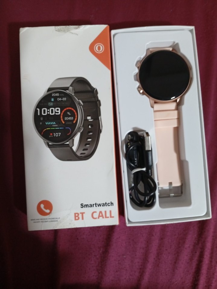 Koyu pembe renkli bu akıllı saat, BT arama özelliği ve net dijital ekranıyla zamanı ve sağlık verilerini gösterir. Şarj kablosu kutu içindedir. ⌚