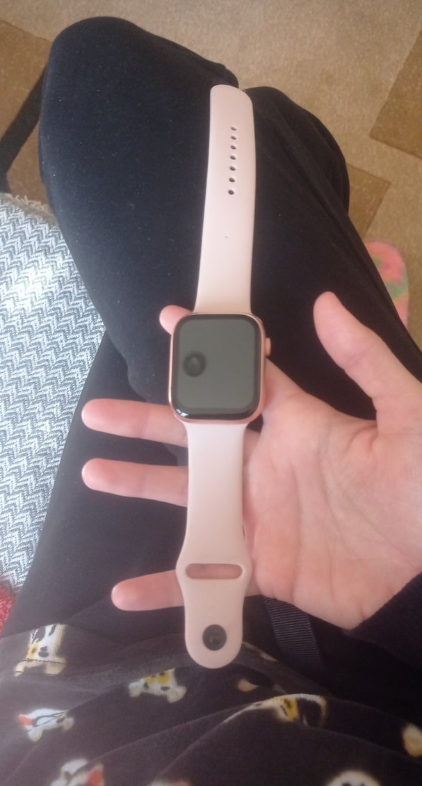 pembe renkli, hafif kayışa ve kare dokunmatik ekrana sahip akıllı saat. ⌚ belirttiğim yerde kolum olmadığı için delik açtım