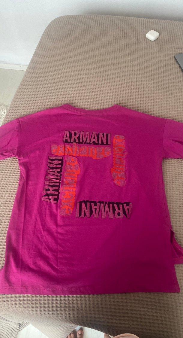 Pembe, dar kesim kadın tişörtü, yuvarlak yaka ve kısa kolludur. Yumuşak sentetik kumaş, sırtında renkli Armani baskıları bulunur. Armani exchange