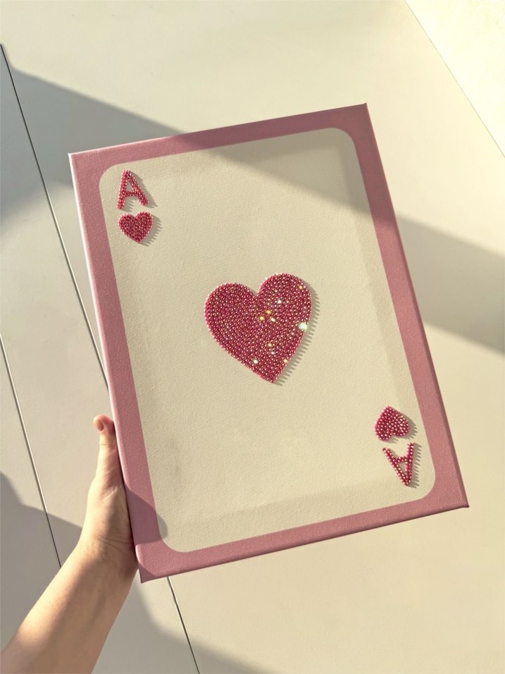 ışıltılı detaylarla süslenmiş pembe As Kupa tasarımı bulunan tablo. Açık renk arka plan ve pembe çerçeveyle dikkat çekiyor. Tuval üzerine akrilik boya ve taş işlemelidir.