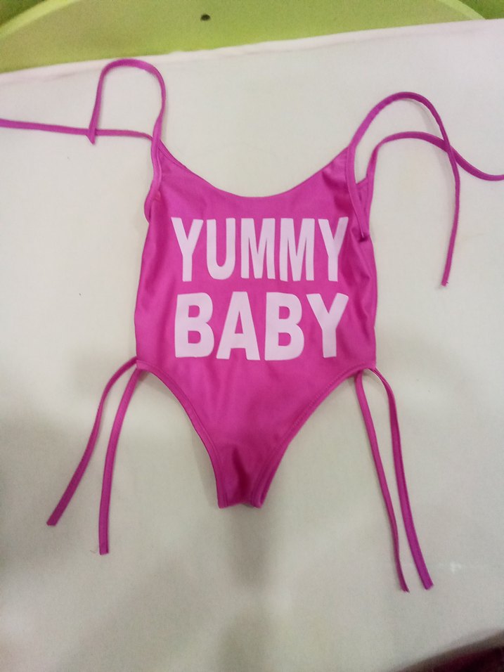 Pembe askılı, halter yakalı bebek mayo, elastik yanlara sahip ve renkli "YUMMY BABY" baskılıdır.