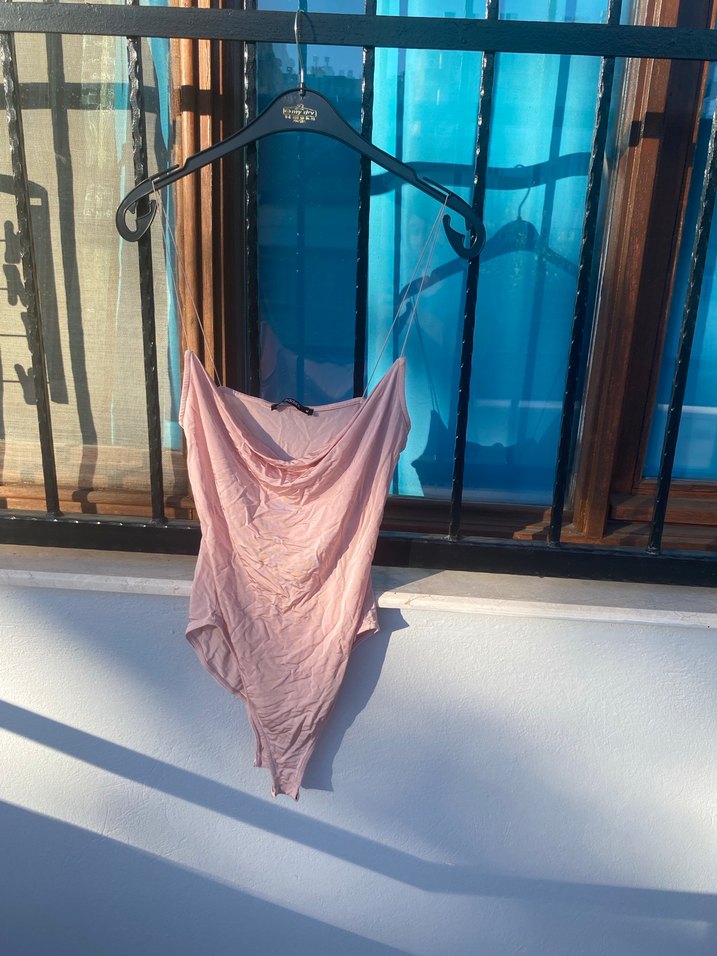 Pastel pembe, degaje yaka, askılı body, m beden.