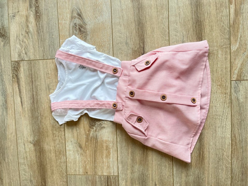 Pamuklu, pembe pastel renkte, düğmeli askılı ve bol kesim kız elbisesi. Yuvarlak yakalı ve desen içermeyen rahat bir sokak stili elbise.