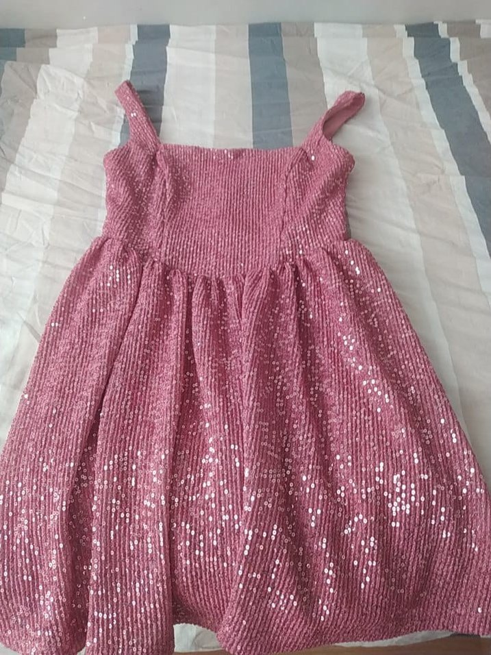 Pembe örme kumaştan, askılı ve straplez yakalı, pilili detaylı, ve parlak görünümlü elbise