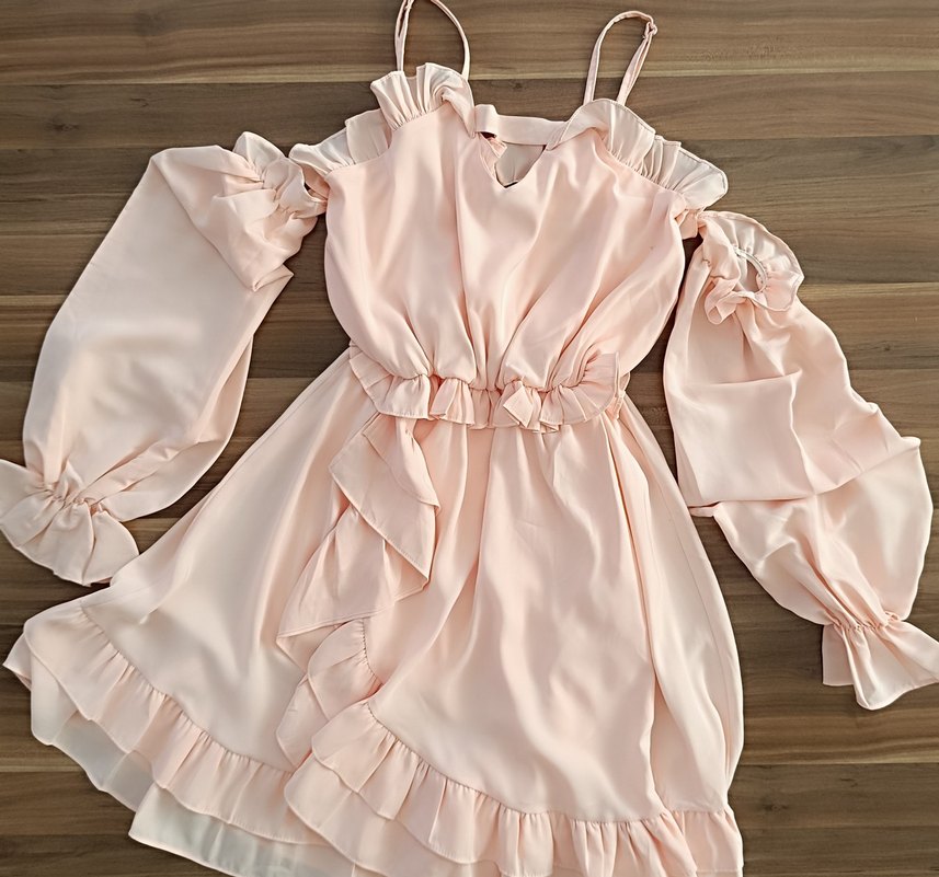 Pastel pembe renkte, askılı ve straplez yaka, fırfırlı detaylara sahip,Salaş kesimli ve ipeksi dokulu, bohem tarzını yansıtıyor.