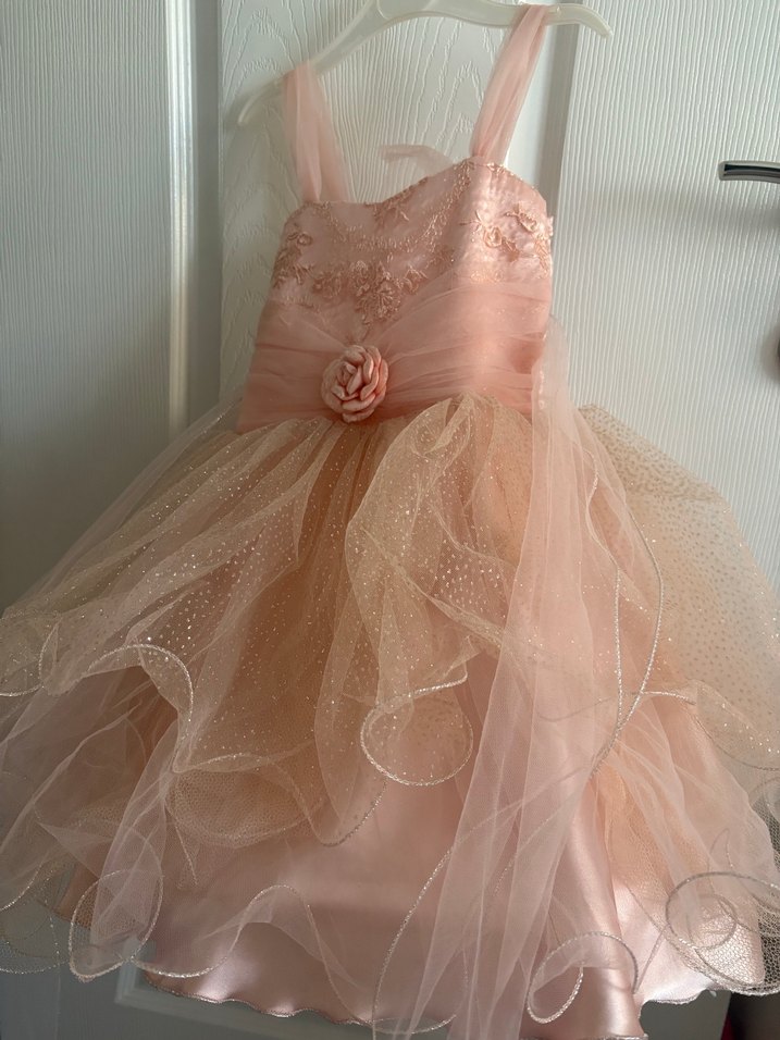 Askılı, işlemeli detaylı ve fırfırlı katmanlara sahip pembe kız çocuk elbisesi. Klasik zarafeti modern tarzla buluşturur.