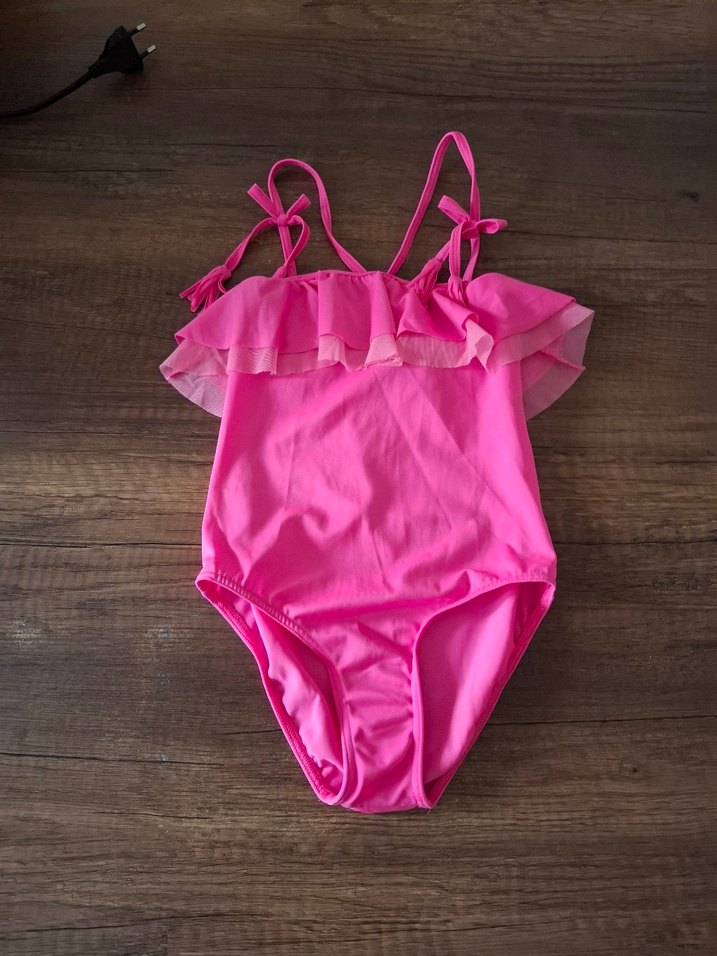 Pembe askılı kız çocuk mayo, göğüs kısmında fırfırlı detay ile. Sade ve renkli tasarım, plaj için uygun.