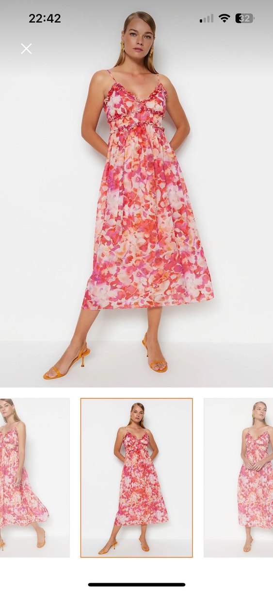 Pembe tonlarında, bir kere kullanıldı ve askılı kollu, bol kesim uzun elbise. Sentetik kumaştan, fırfır detaylı, romantik akşamlar için uygun.
