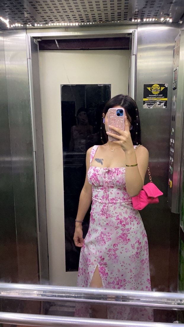 Pembe, kolsuz midi elbise, dantel detaylı ve pastel tonlarda batik desenlidir, günlük sokak stiline uygundur.