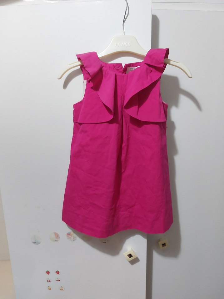 Pembe askısız elbise, fırfır detaylı ve rahat kesimlidir. Yumuşak sentetik kumaştan yapılmıştır, renkli ve normcore tarz için uygundur.