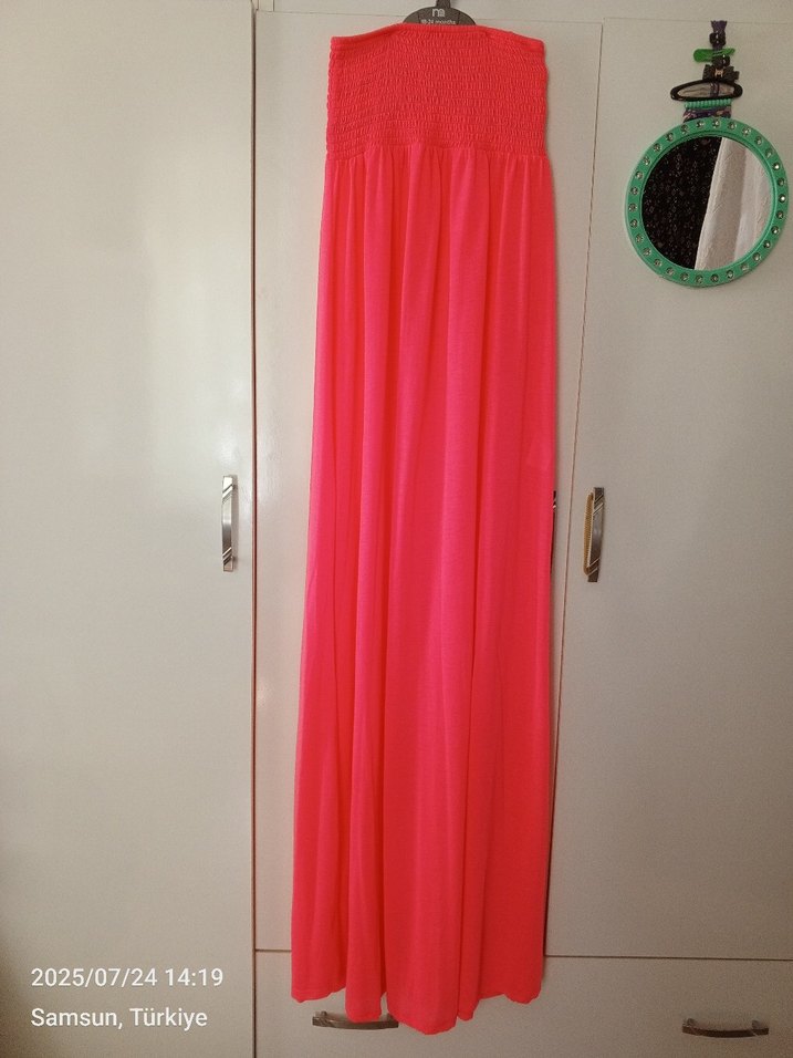 Pembe renkli, askısız ve uzun, salaş kesim elbise. İpek gibi dokusu ve drapeliyle yaz akşamları için uygundur. Minimalist ve çağdaş tarzda, desensiz.marka temsilidir