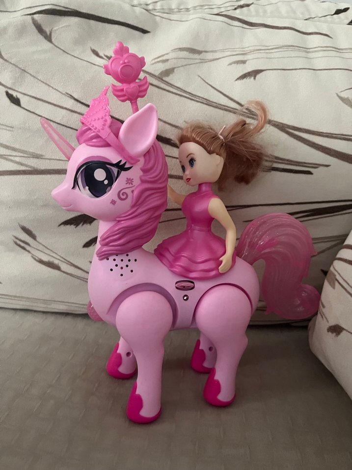 Pastel pembe renkte, üzerinde bebek figürü bulunan at şeklinde aksiyon oyuncağı. Büyük gözler ve süslemelerle detaylandırılmıştır.