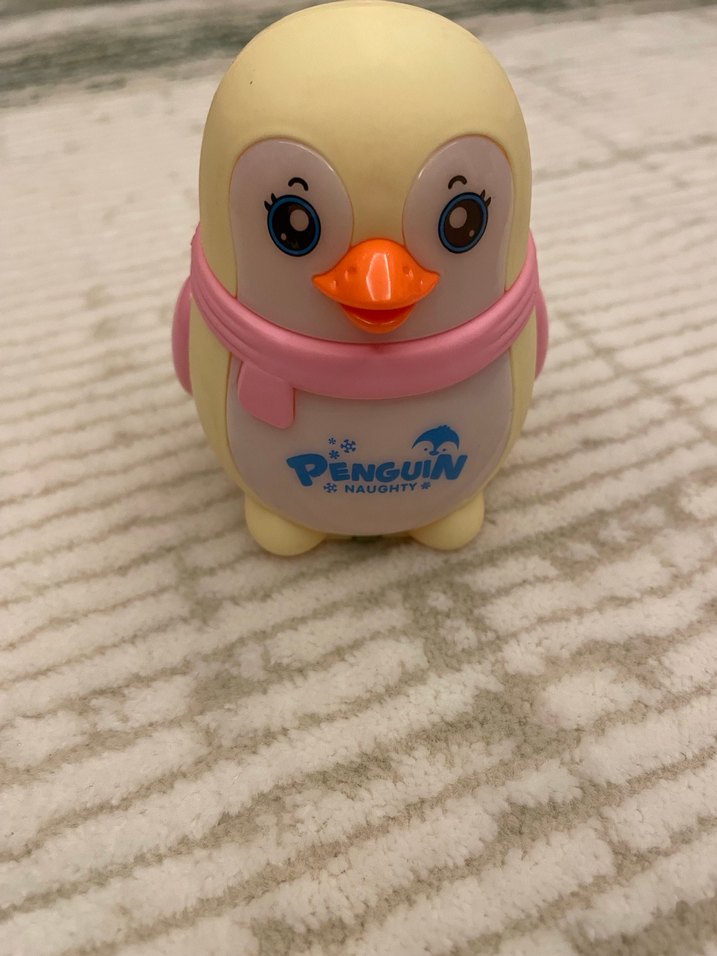 Canlı renklerde, pembe atkılı ve parlak gözlü penguen oyuncağı. Önünde "Penguin Naughty" yazısı bulunur.