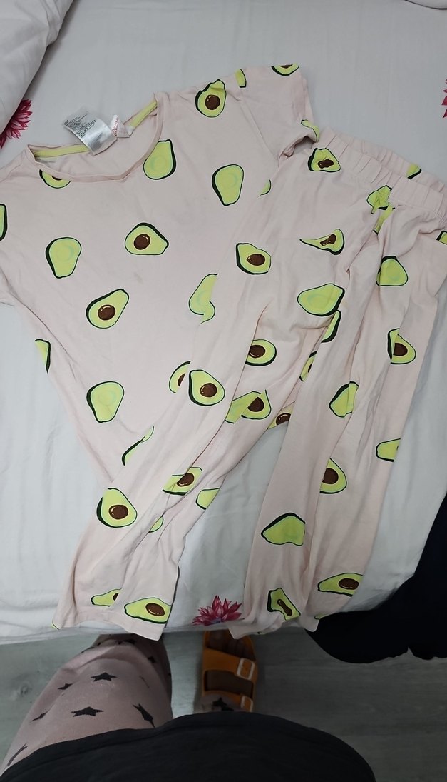 Pembe pastel renkte, avokado desenli, kısa kollu, bol ve uzun cocuk pijama takımıdır. Rahat ve konforlu bir uyku için uygundur. bır kac lekesi var