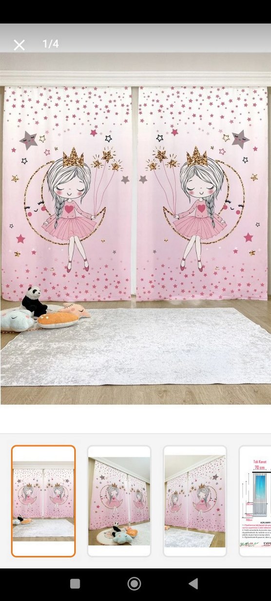 Pembe tonlarda, baskılı kız figürü ve yıldızlar içeren perde. ölçüsü 70*260 . iki adettir neredeyse kullanilmamistir . . fiyat en sondur asla pazarlik yoktur