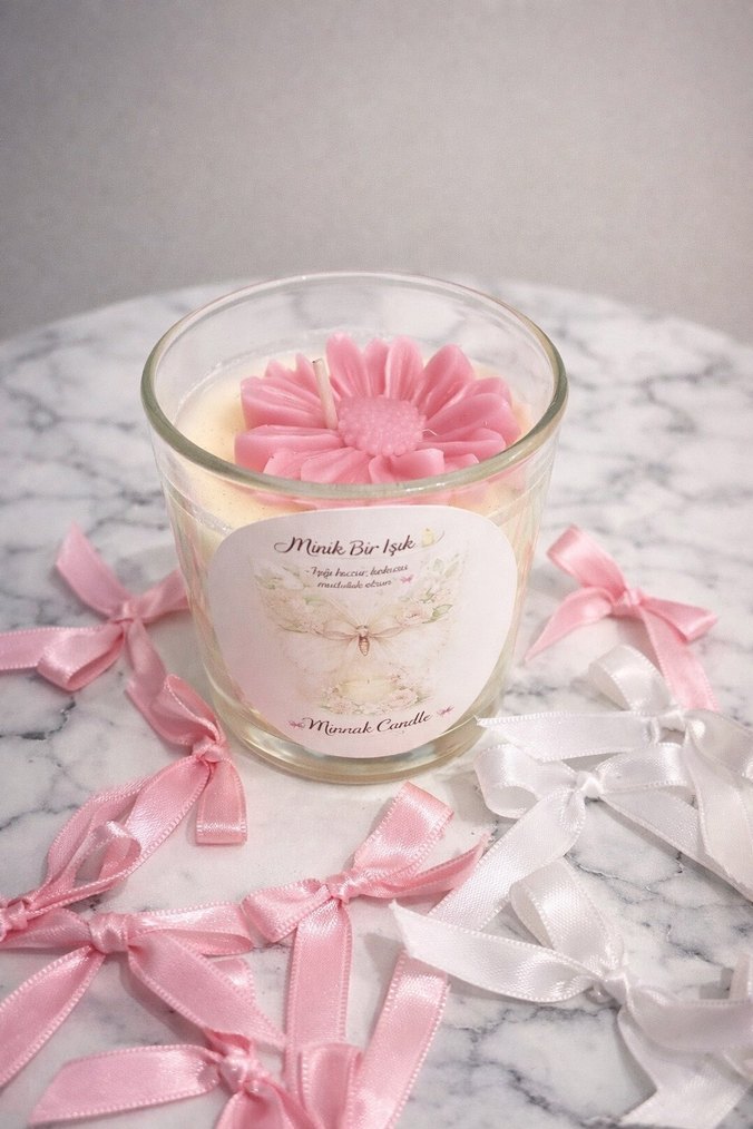 Pastel pembe renkte, ayçiçeği tasarımlı cam mumluk içinde şık bir mum. Mekanlara yumuşak ve dekoratif bir dokunuş sağlar. Vanille Yumuşak,sarıp sarmalayan vanilya keyfi