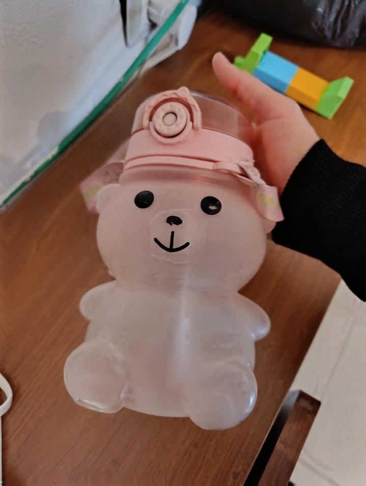 Pembe ayı figürlü çocuk matara, güvenli kapaklıdır ve pastel renkte yumuşak bir görünüme sahiptir.