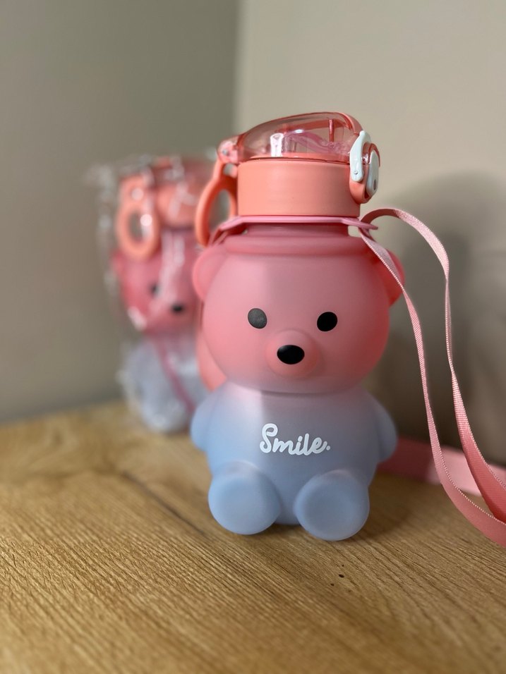 Pastel pembe renkli çocuk termos, ayıcık figürlü, kapaklı ve taşıma askılıdır. Üzerinde "Smile" yazısı vardır.