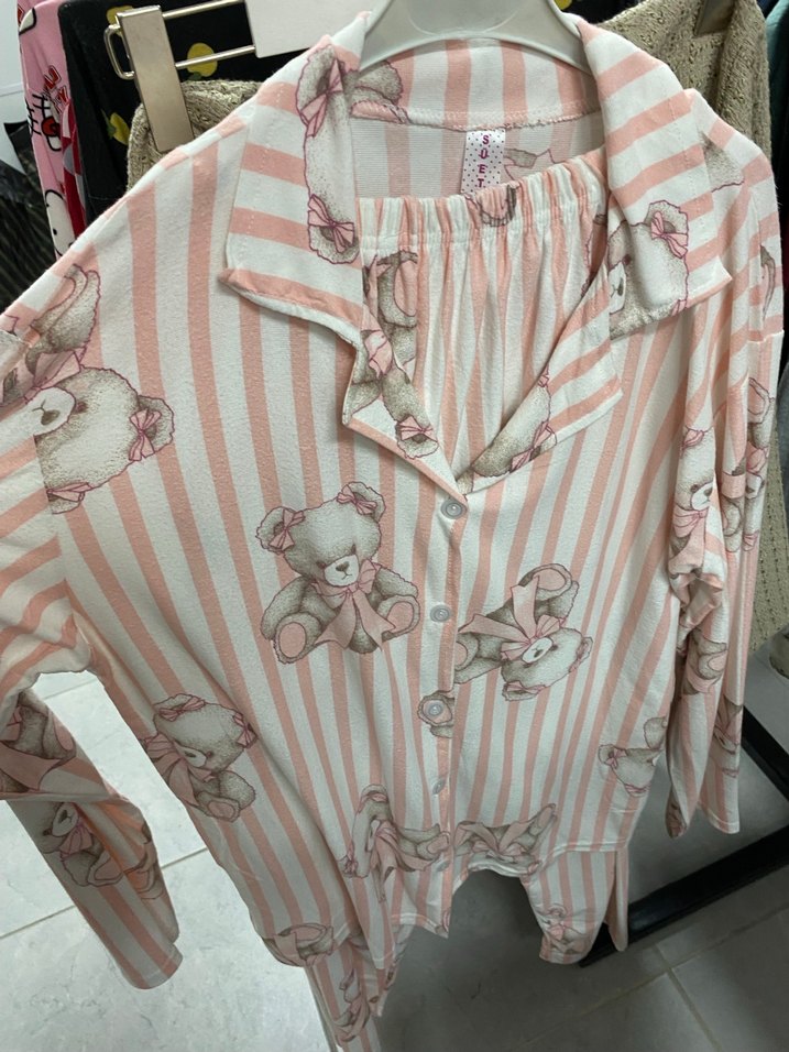 Rahat kesim, pastel pembe çizgili ve ayıcık desenli kadın pijama takımı, düğmeli ön ve yumuşak kumaşlıdır. M xl ve xxl bedenlerı vardır