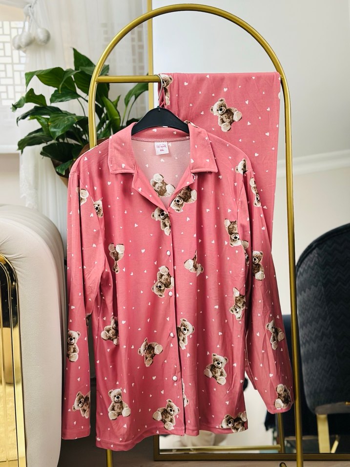 Pembe renkli, uzun kollu ve ayıcık desenli rahat kesim kadın pijama takımı. Midi boy pantolon ve düğmeli üstü ile konforlu ve şık bir tercih.