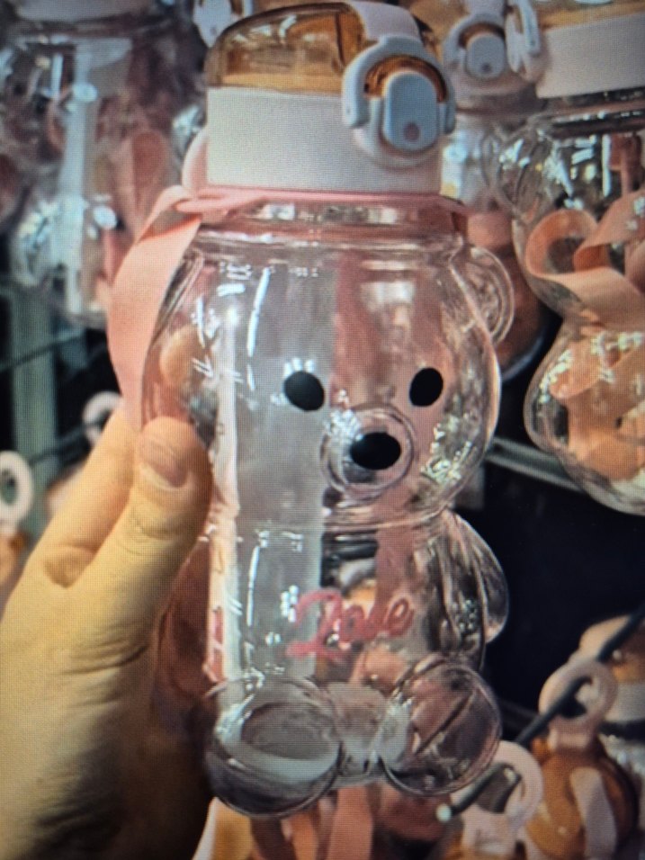 Pastel pembe renkte, şeffaf ayıcık şeklinde çocuk matara, kilitli açılır kapak ve taşıma askısı ile.