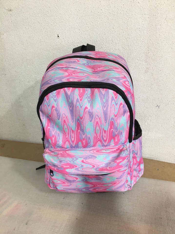 Pembe tonlarında bağcıklı detaylı batik desenli renkli sırt çantası. Sentetik kumaştan, sokak stili ve spor tarzına uygun.