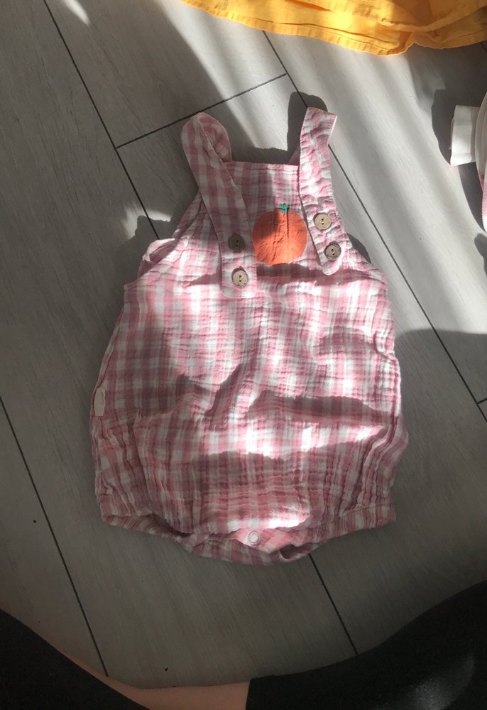 Pastel pembe renkli, bağcıklı askıları ve hafif batik desenli bebek kız tulumu. Yumuşak kumaş rahatlık sağlar.