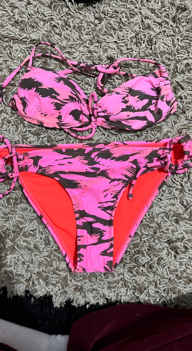 Pembe desenli, bağcıklı ve dantelli detaylara sahip, vücuda oturan kadın bikini takımı, plaj için uygundur. Üst kısmı s alt kısmı M bedendir