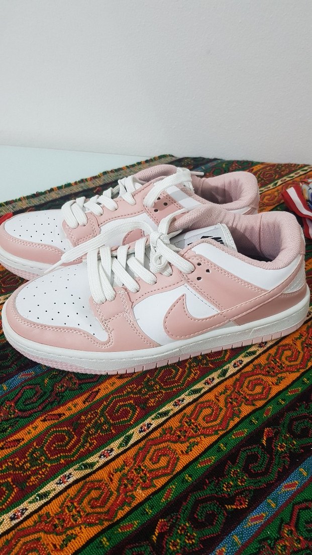 Bu kadın spor ayakkabıları, pastel pembe ve beyaz bağcıklı tasarıma sahip, blok topuklu ve kauçuk tabanlıdır. Günlük kullanım için uygun, sokak modası ve athleisure tarzını birleştirir.