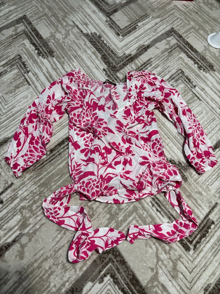 Pembe bağcıklı bohem bluzu, uzun kollu ve V yaka. Pamuklu kumaştan, kısa ve bol kesim.