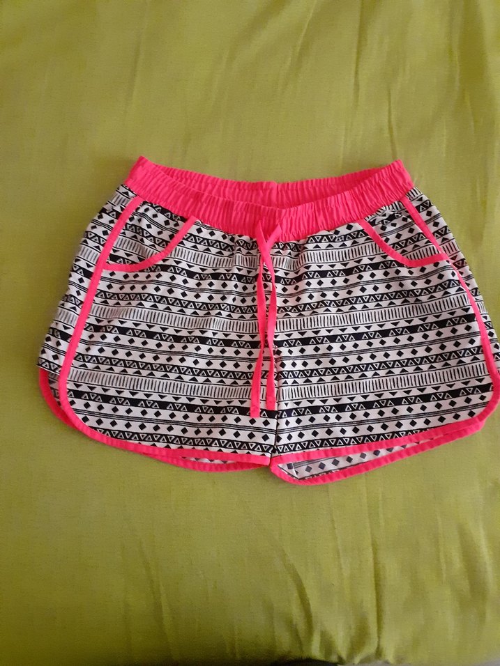 Renkli, bol kesim bohem tarzı şort, siyah-beyaz geometrik desenli ve pembe dantel detaylı. Sentetik kumaştan, açık hava sokak giyimi için uygun.