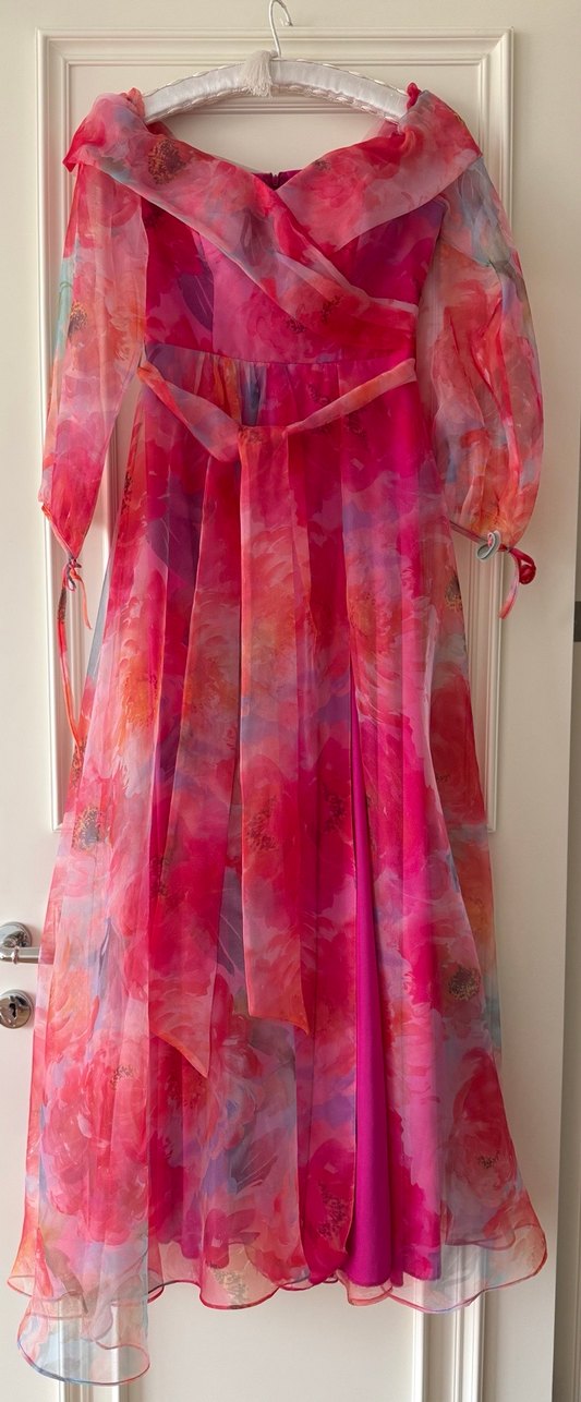 Pembe, bağcıklı, uzun, dökümlü ve bağcıklı madonna yaka detaylı ve yırtmaçlı bir elbisedir. İsteyenlerle en/boy bilgisi paylaşabilirim. 38-40 beden rahat olur.