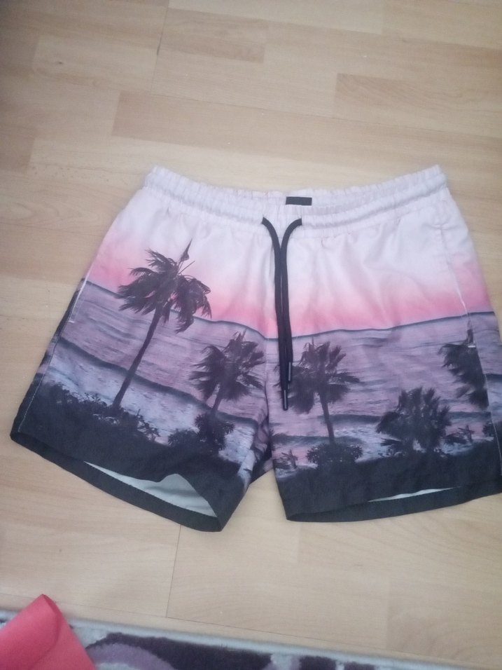 Pembe tonlarında, pastel batik desenli erkek deniz şortu. Gevşek kesim, elastik bel ve bağcıklı detay içerir. içindeki file rahatsız ettiğinden dolayı kesilmiştir
